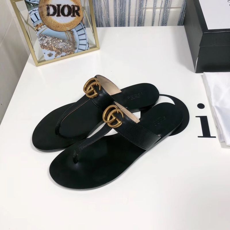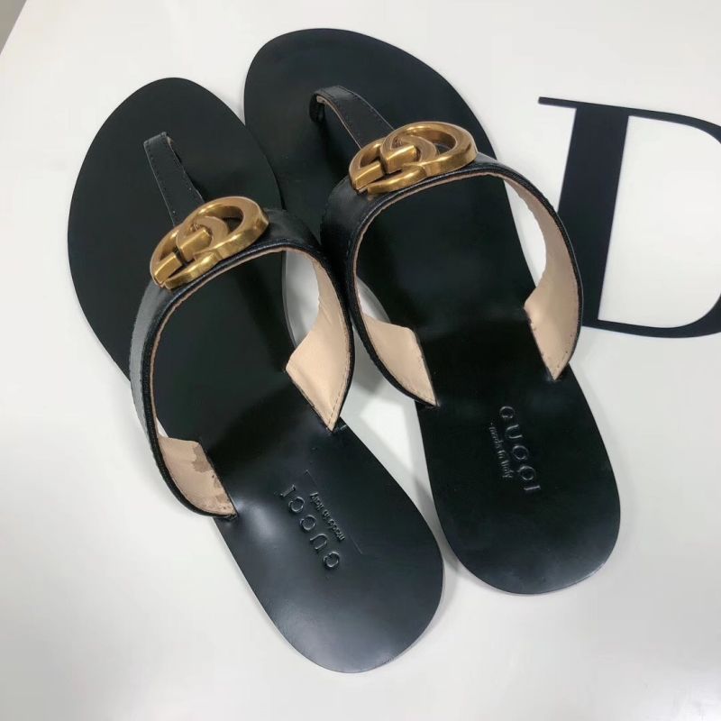 Leather thong sandal with Double G hardware - a design from the 70s. Black leather, Double G hardware, leather sole,