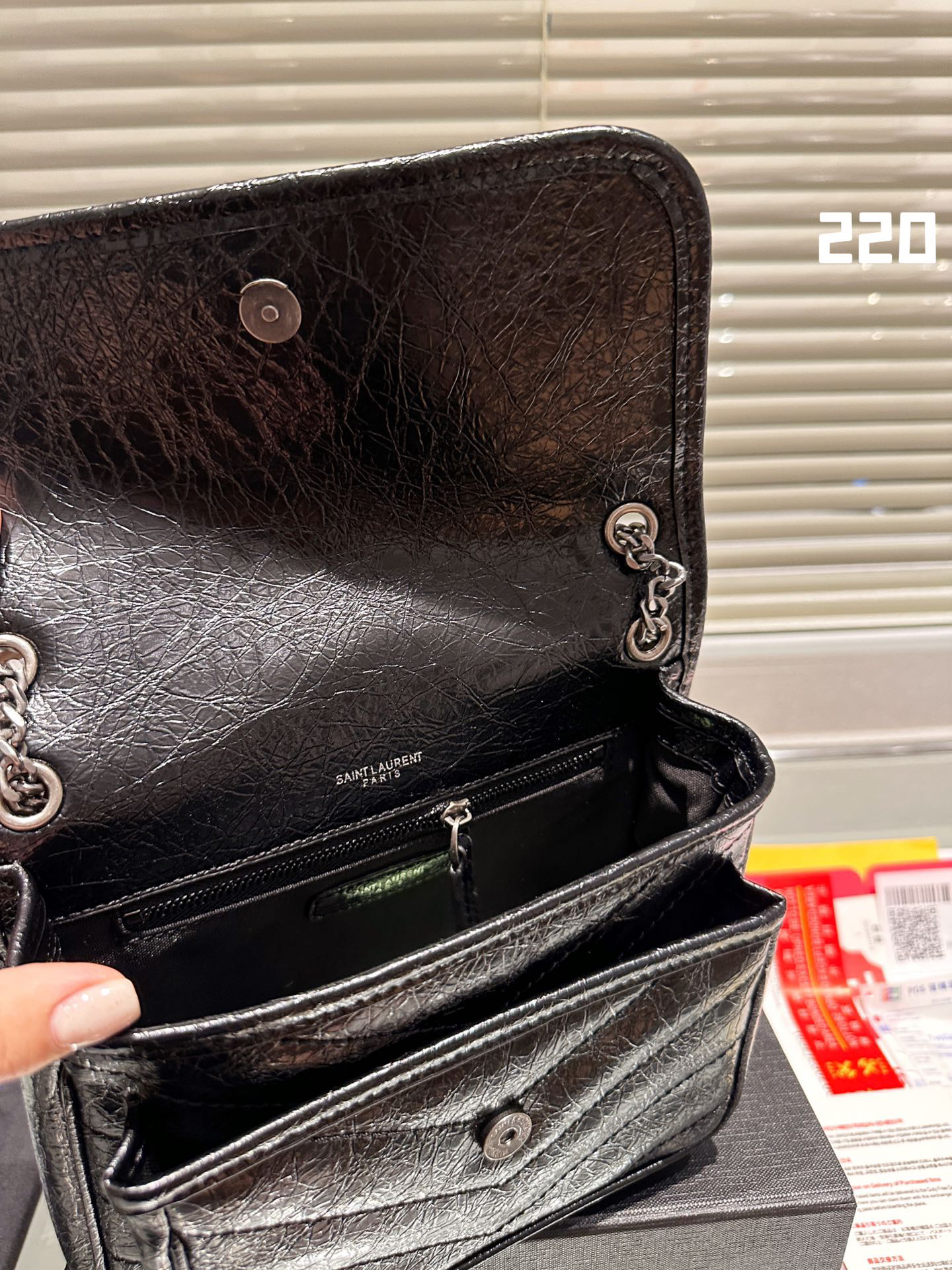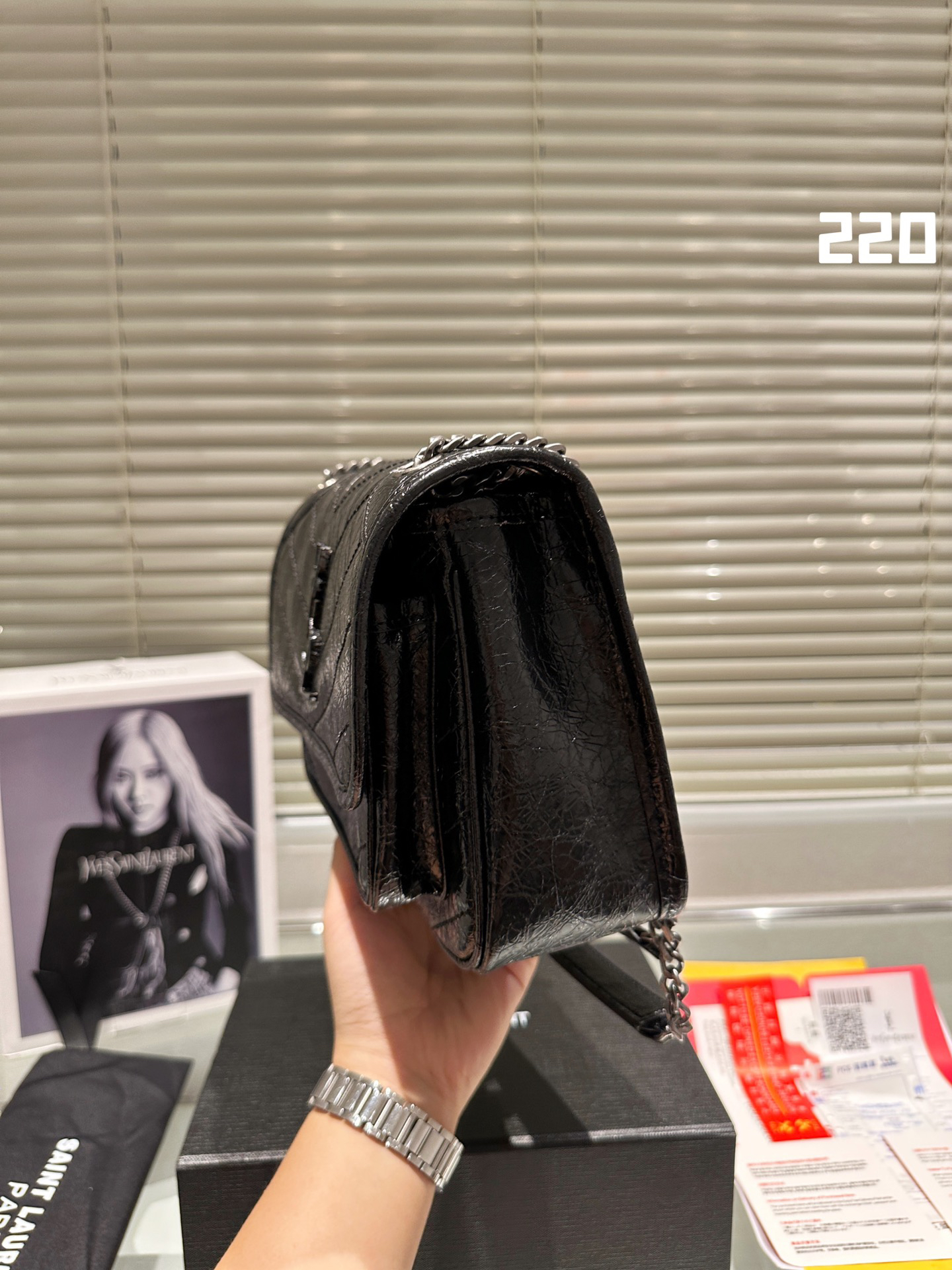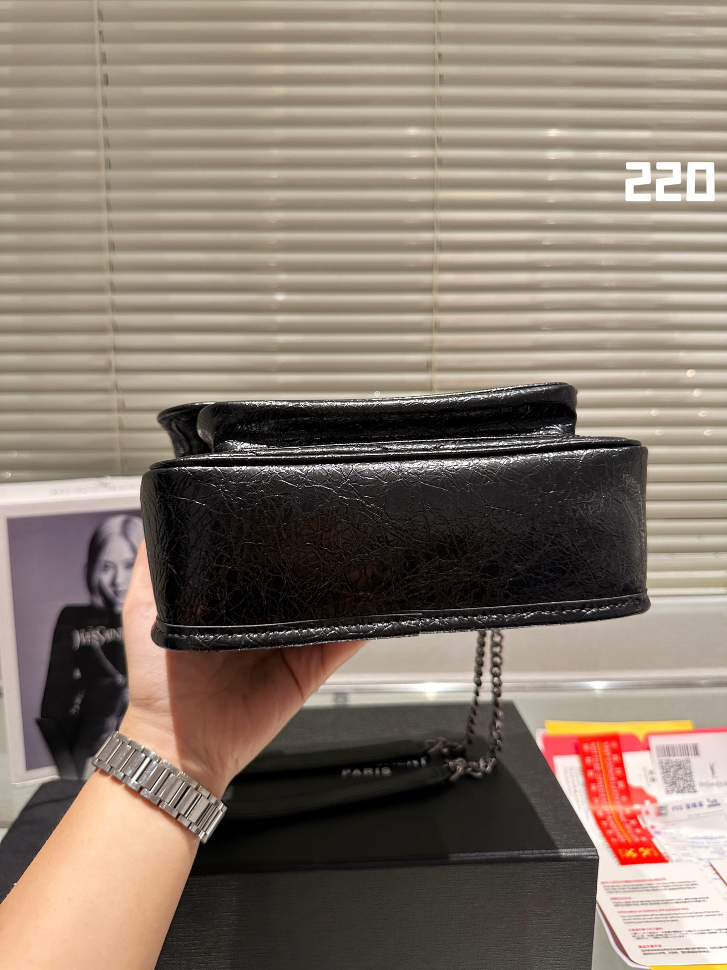 Comes with a sliding chain shoulder strap to carry over the shoulder or across the body.