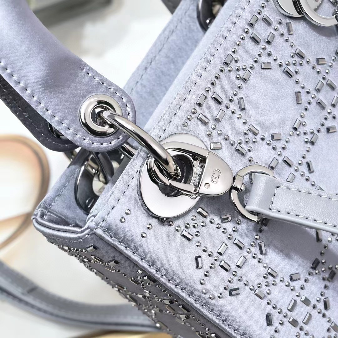 This Lady Dior bag epitomizes Dior's deep vision of elegance and beauty. Its chic and elegant design is timeless. Crafted from black satin, it is embellished with crystals for a sophisticated evening look. It is embellished with a metal-coated D.I.O.R. charm, adding a touch of agility to the exquisite silhouette. The mini version, with a detachable satin spaghetti strap, can be carried by hand or across the body, making it an ideal companion for evening wear.